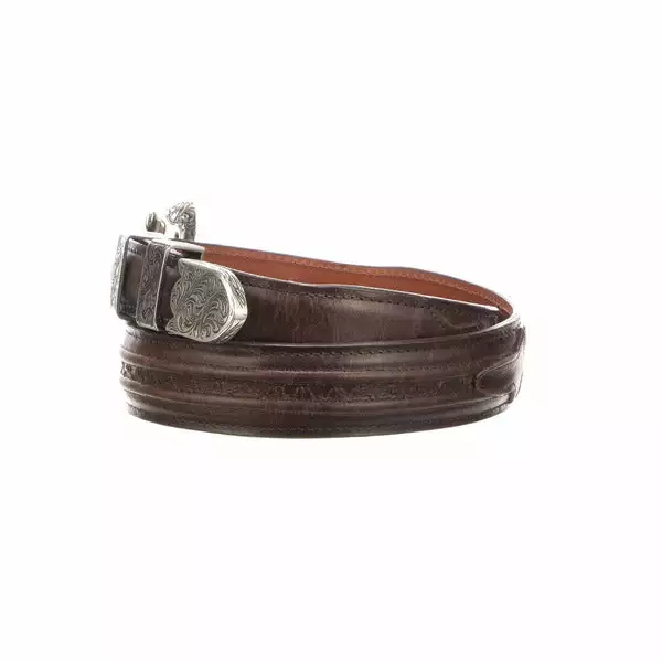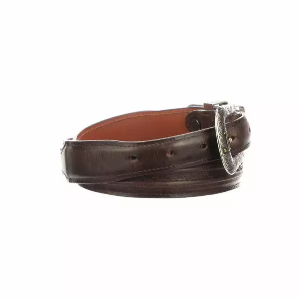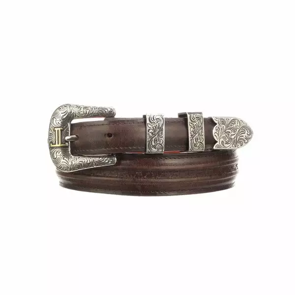 Lucchese men’s belt made with cowhide leather. Lucchese craftsmen use a unique polish method that create different hues and add texture to the leather, giving it a vintage look. The belt features hobby stitching and a silver plated buckle with Western details, adding style and character. Handmade in Texas. 1.25″ tapered down to 1″ Hobby stitching Silver plated tip Removable buckle