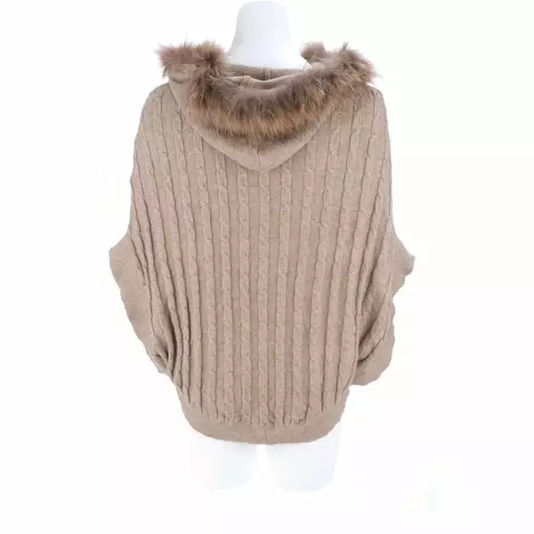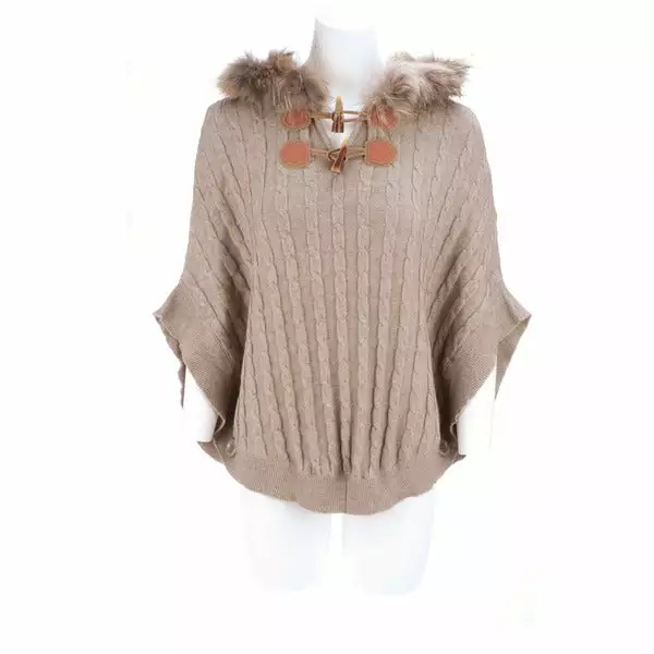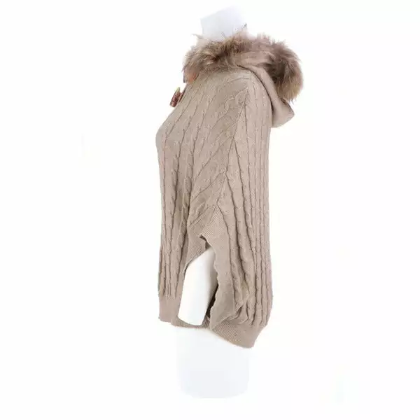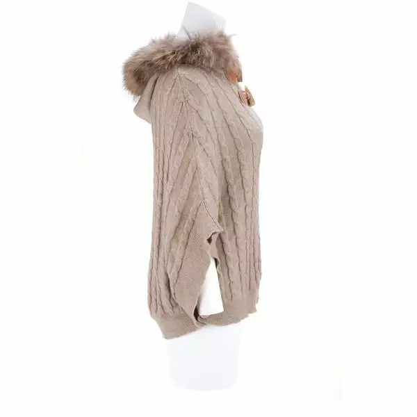 Get ready for cooler temperatures with our elegant Cable Knit Poncho. Complete with a fox-lined hood, this poncho is the height of elegance and comfort. Made from the softest cashmere blend with cable knitted style, you won’t want to take this off. Cashmere blend: 90% Cashmere, 10% angora Fox fur-lined hood Genuine leather-trimmed horn clasps
