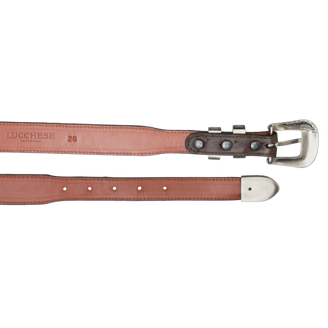 Luccheseβs exotic belt made with full quill ostrich leather. The beltβs full quill ostrich leather is complemented by an ornate silver plated buckle giving it the ultimate Western touch, making it versatile, handsome, and stylish. This belt was designed to be worn with matching full quill ostrich boots, but can also be paired with jeans or a suit. Handmade in Texas. 1.25″ tapered down to 1″ Silver plated tip Removable buckle