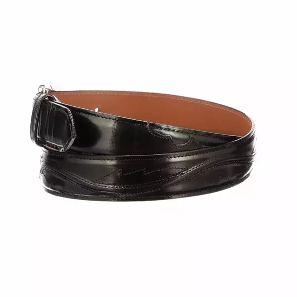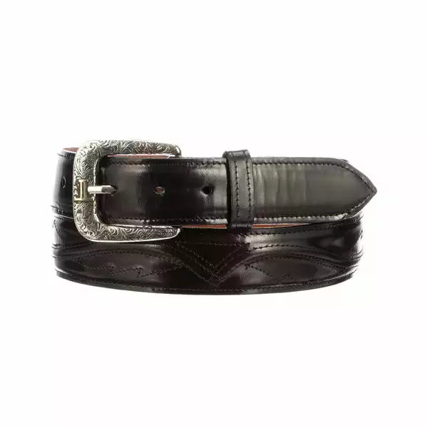 Lucchese men’s belt made with burnished goat leather. Lucchese craftsmen use a unique polish method that create different hues and add texture to the leather, giving it a vintage look. The belt’s design features subtle Western elements with its seville stitching and silver plated buckle– perfect for jeans or a suit. Handmade in Texas. 1.5″ wide Seville stitching Removable buckle