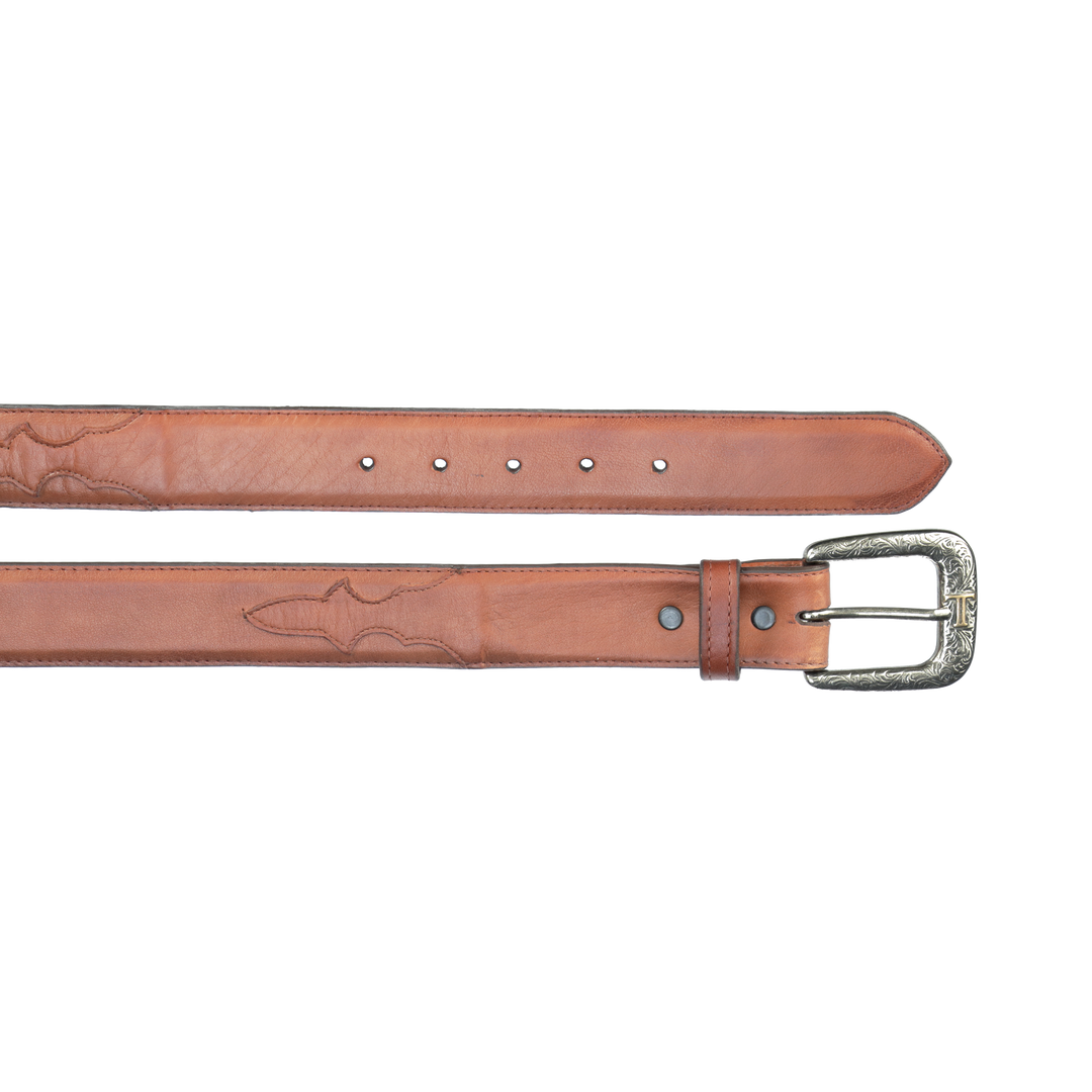 Lucchese menβs belt made with baby buffalo leather. Lucchese craftsmen use a unique polish method that create different hues and add texture to the leather, giving it a vintage look. Made with buffalo leather, this belt is thick and has good durability. Its Southwest buckle add style and versatility to this classic men’s belt. Handmade in Texas. 1.5″ wide Removable buckle